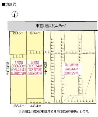 ■名古屋市瑞穂区岳見町5丁目 ◇googleMAPで場所を確認 ■交通:地下鉄 名城線「瑞穂運動場東」駅 徒歩11分 ■敷地面積:(実測)1号地:308.80u(93.41坪)、2号地:309.34u(93.57坪) ■都市計画:市街化区域 ■用途地域:第一種低層住居専用地域 ■地目:山林 ■建ペイ率:30% ■容積率:100% ■接道状況:北側幅員約4.6mの公道に1号地は約8.5m、2号地は約8.4m接道 ■設備:上下水道、都市ガス、下水道 ■現況:更地 ■引渡:相談 ■取引態様:仲介