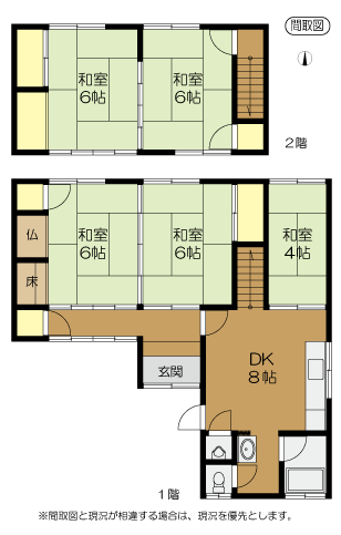 ■名古屋市中川区下之一色町字北ノ切 ◇googleMAPで場所を確認 ■交通:市バス「一色大橋」停 徒歩5分 ■使用部分:1階60.42㎡・2階26.49㎡・合計86.91㎡(26.29坪) ■構造:木造瓦葺2階建 ■間取:5DK(DK(8)・和室(6.6.6.6.4)) ■築年月:昭和56年8月 ■総戸数:1棟 ■接道状況:接道無 ■現況:空室 ■引渡:相談 ■設備:上水道・下水道・都市ガス ■駐車場:無