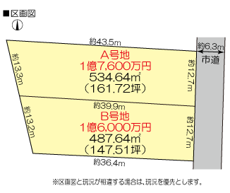 ■名古屋市瑞穂区春山町 ◇googleMAPで場所を確認 ■地下鉄名城線「総合リハビリセンター」駅 徒歩8分 ■土地:A号地 534.64u(161.72坪)、 B号地 487.64u(147.64坪) ■都市計画:市街化区域 ■用途地域:第一種低層住居専用地域 ■建ペイ率:30% ■容積率:100% ■接道状況:東側幅員約6.3mの公道に、A号地:間口約12.7m接道、B号地:間口約12.7m接道 ■地目:宅地 ■現況:更地 ■設備:公営水道、都市ガス、下水道 ■その他:6番9より分筆渡し ■引渡:相談 ■取引態様:仲介