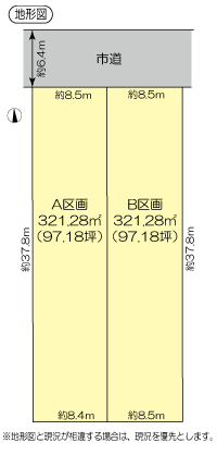 ■あま市七宝町桂境之橋 ◇googleMAPで場所を確認 ■交通:名鉄バス「秋竹」停徒歩4分、名鉄津島線「七宝」駅徒歩41分 ■土地:公簿・A区画:321.28u(97.18坪)、B区画:321.28u(97.18坪) ■用途地域:第2種中高層住居専用地域 ■都市計画:市街化区域 ■建ぺい率:60% ■容積率:200% ■地目:雑種地 ■現況:雑種地 ■設備:公営水道、都市ガス、浄化槽 ■接道状況:北側幅員約6.4mの公道に、間口約17m接道 ■引渡日:相談 ■取引態様:仲介